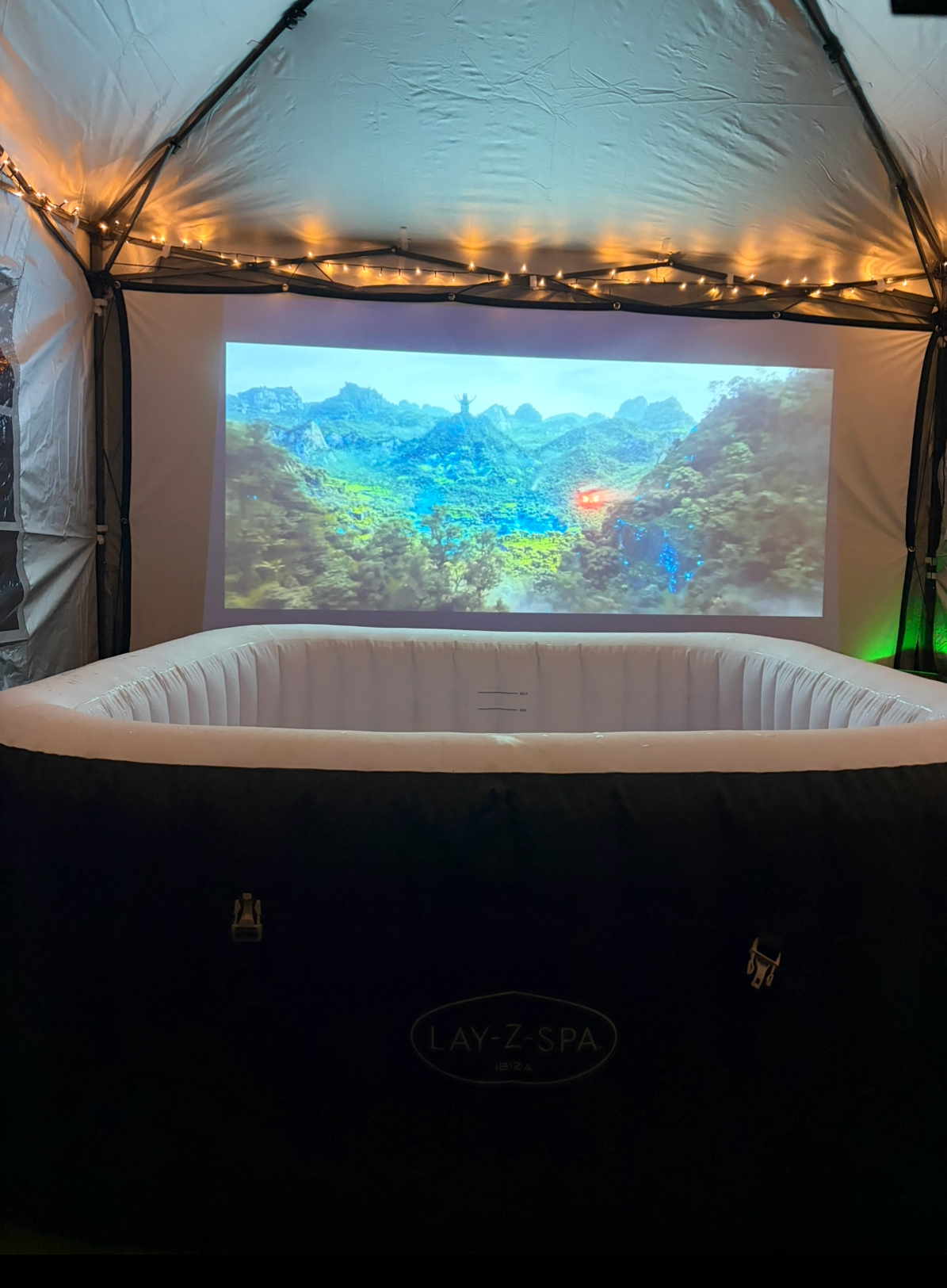 🏕️ 3×3 gazebo with sides – fully enclosed, weather-resistant space for comfort and privacyRelax in your hot tub, get snug in the gazebo, and enjoy your favourite films in style. We provide full delivery, setup, and pack-down, so all you need to do is bring the snacks and press play.